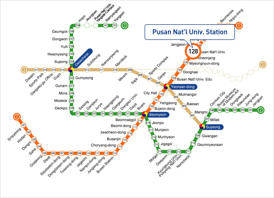 The easiest way to get to PNU Pusan Campus from downtown Busan by mass transit is to use the subway. You are recommended to get off at Pusan National University Subway Station on Subway Line No. 1, leave the station via exit No. 3, and walk to the main gate of PNU. If you wish to visit Sangnam International House or buildings near the north gate, you are recommended to get off at Jangjeon Subway Station and use the ramp opposite to the traffic lane. The subway fare ranges from KRW 1,100 to KRW 1,200, and it may vary depending on the distance.